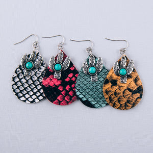 Snakeskin teardrop earrings featuring cactus and turquoise details