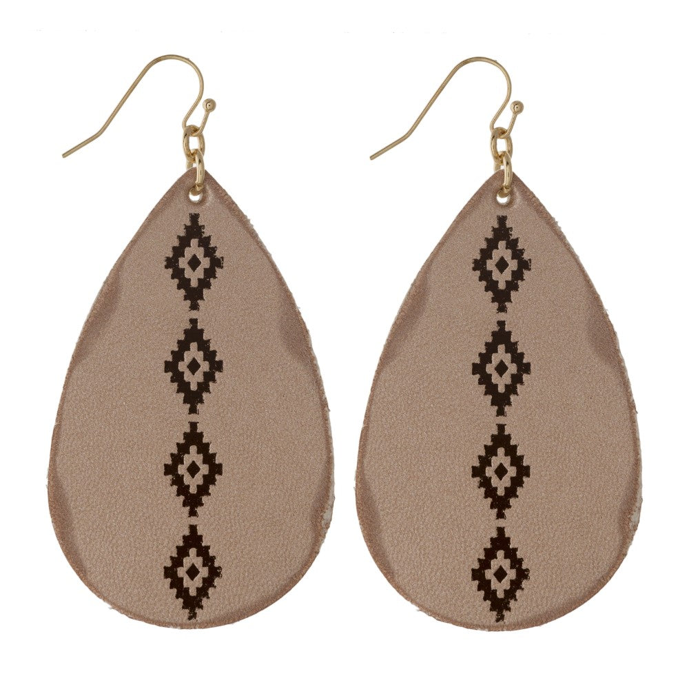 Long fishhook earring with faux leather teardrop shape. Approximately 2" in length.